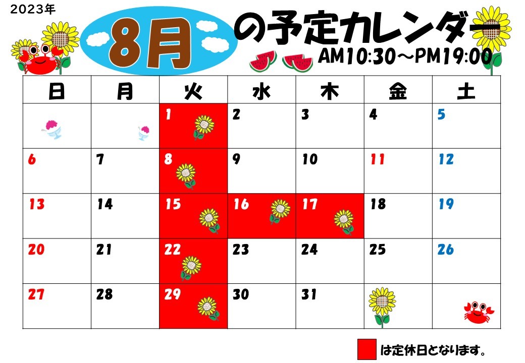 8月定休日のお知らせ ポスト 2023年8月1日 いつもタイヤ館守山のホームページを ご覧頂き誠にありがとうございます★★ ★8月の定休日のお知らせです★ 8月15(火)・16(水)・17(木)は夏季休暇とさせて頂きます! お間違えの無いよう宜しくお願い致します。 タイヤ館 守山 住所:524-0052滋賀県守山市大門町28-1 電話番号: 077-583-7567 相談予約 タイヤ点検・安全点検/タイヤ履き替え/オイル交換/その他ピット作業の予約