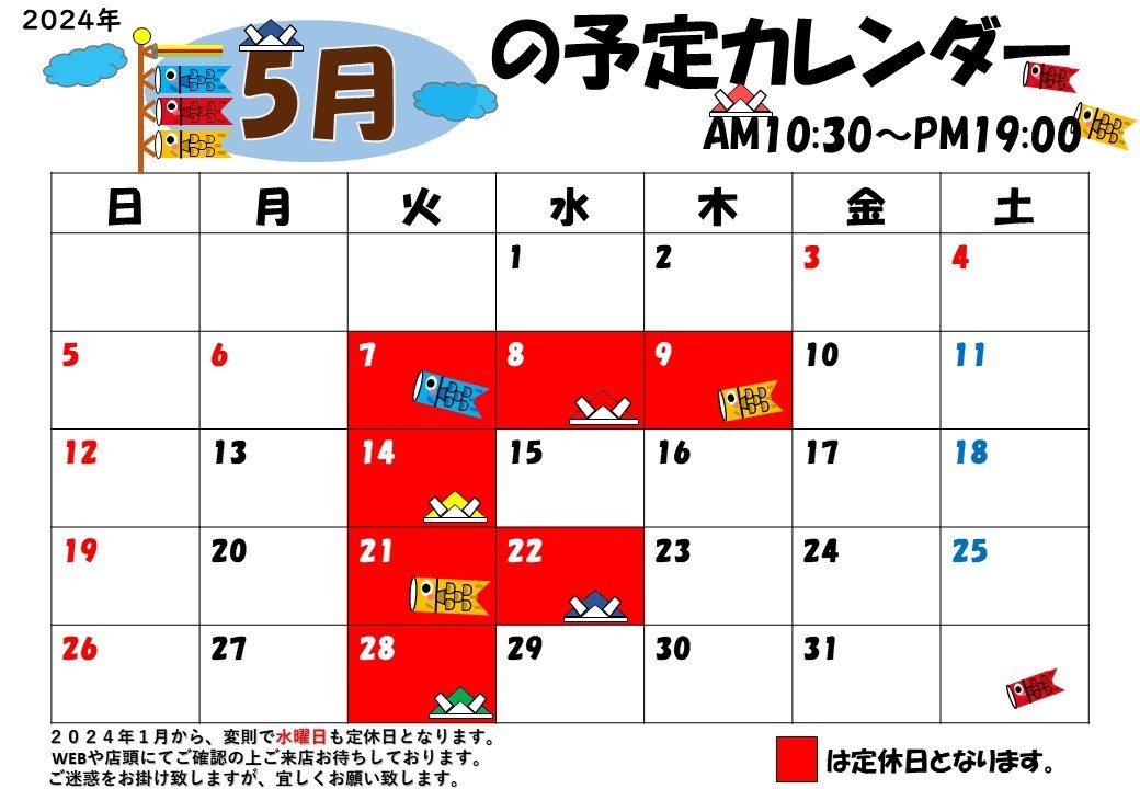 ☆★☆ゴールデンウィーク期間の営業と5月定休日のお知らせ☆★☆