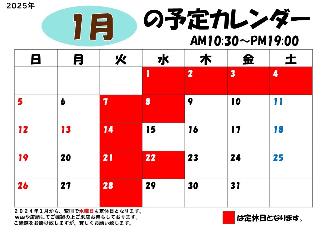 ★1月 定休日のお知らせです★