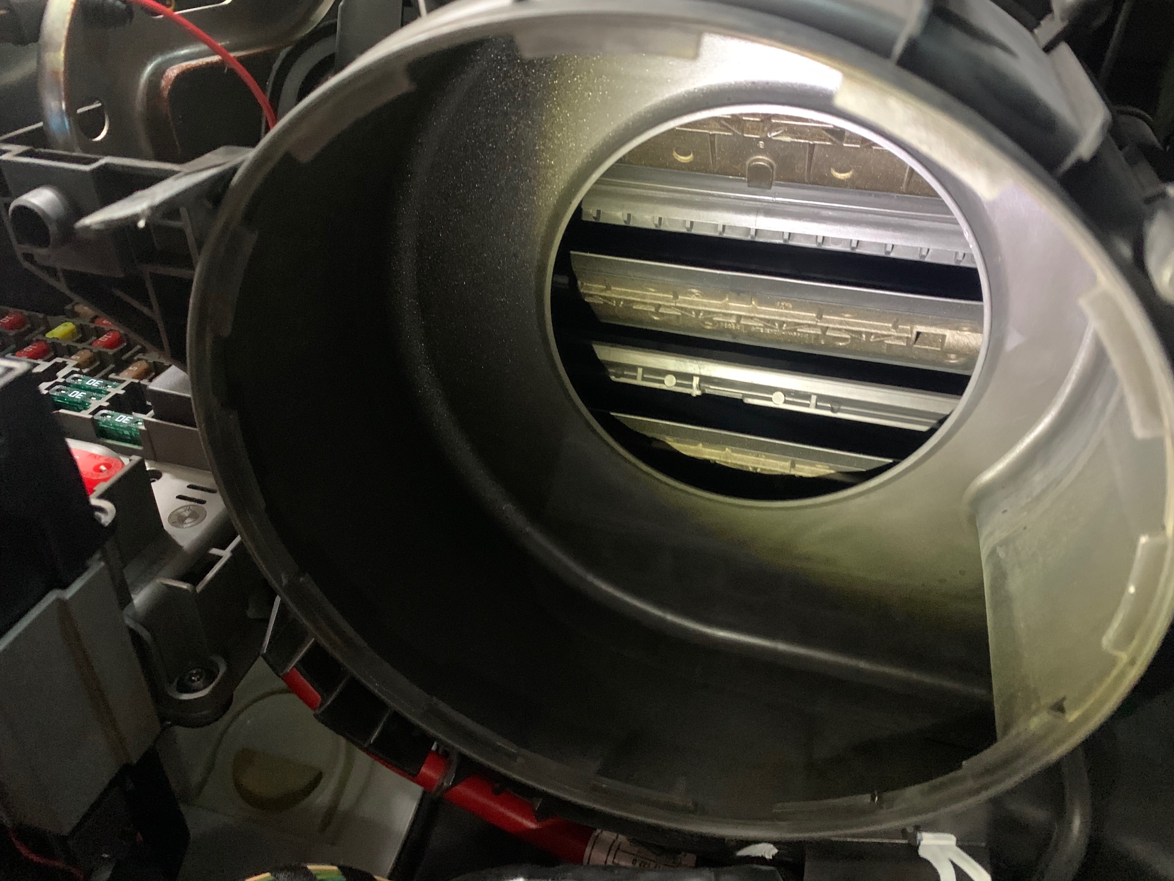 まずは助手席足元の内装パーツを外して、エアコンの内部を露出させていきます