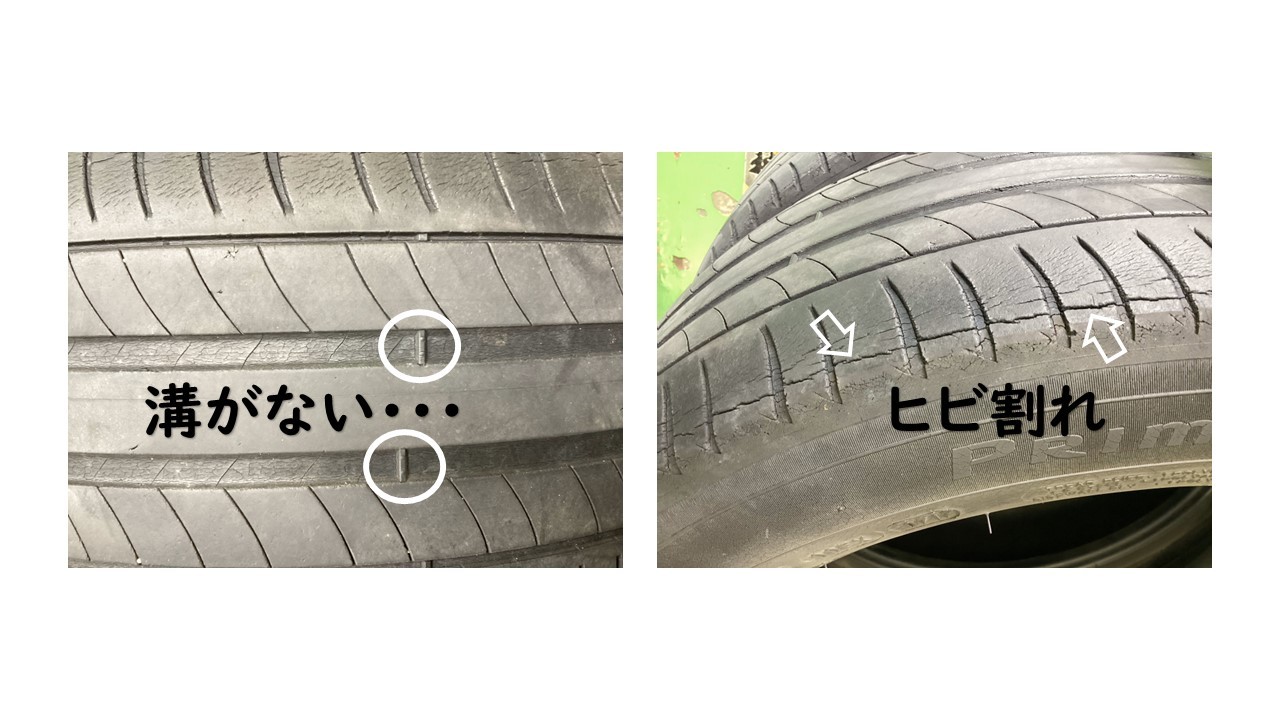 交換される前のタイヤは、経年劣化によるヒビ割れ、溝も無くなっていました。