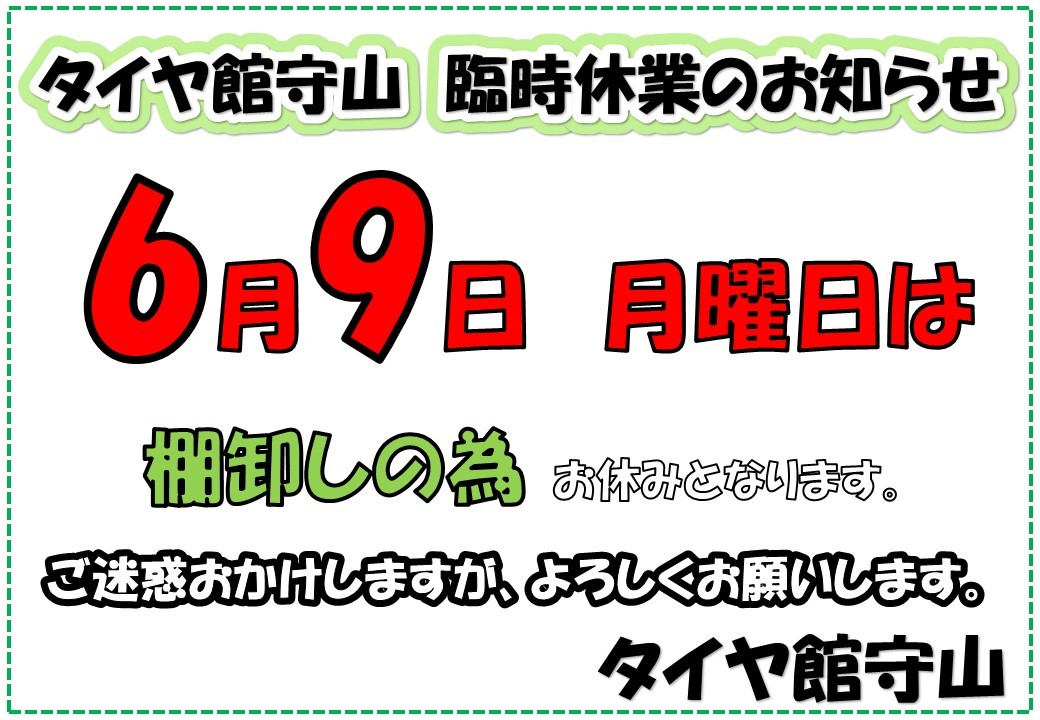 臨時休業のお知らせです。 ポスト 2025年6月8日 タイヤ館 守山 住所:524-0052滋賀県守山市大門町28-1 電話番号: 077-583-7567 相談予約 タイヤ点検・安全点検/タイヤ履き替え/オイル交換/その他ピット作業の予約 カテゴリ:お知らせ 商品情報