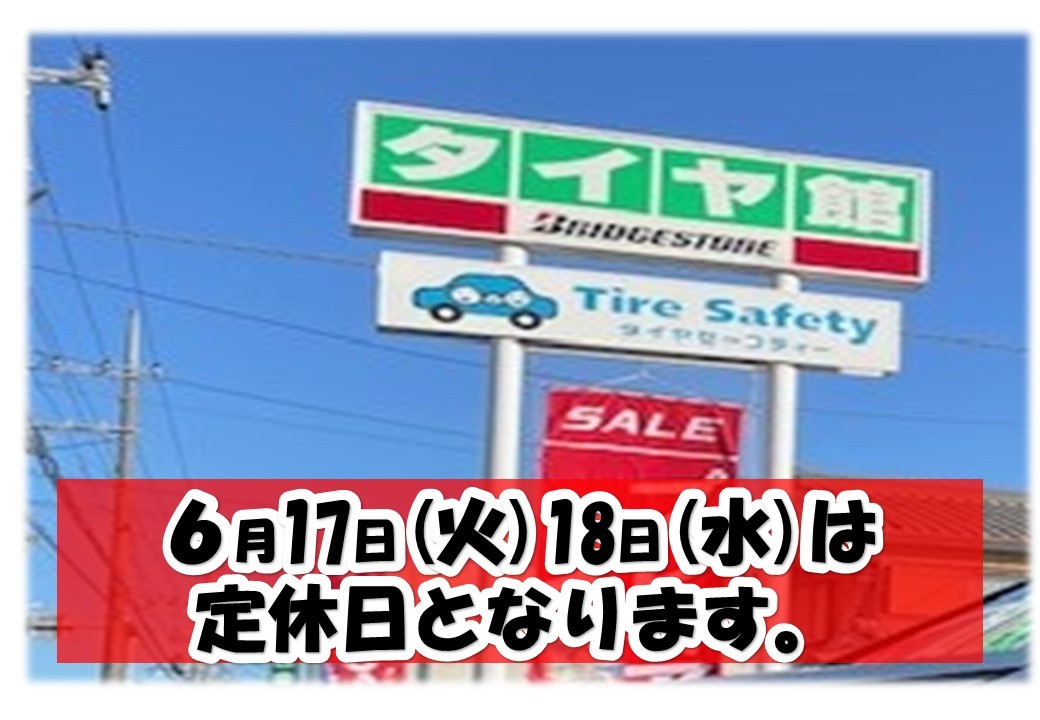 ★6月17日(火)・18日(水)は定休日です★ ポスト 2025年6月16日 いつもタイヤ館守山のWEBをご覧いただきありがとうございます! 滋賀県にあります、タイヤ館守山店 定休日のご案内です! ※2024年1月から変則で水曜日も定休日となりました。 宜しくお願い致します! タイヤ館 守山 住所:524-0052滋賀県守山市大門町28-1 電話番号: 077-583-7567 相談予約 タイヤ点検・安全点検/タイヤ履き替え/オイル交換/その他ピット作業の予約 カテゴリ:お知らせ 商品情報
