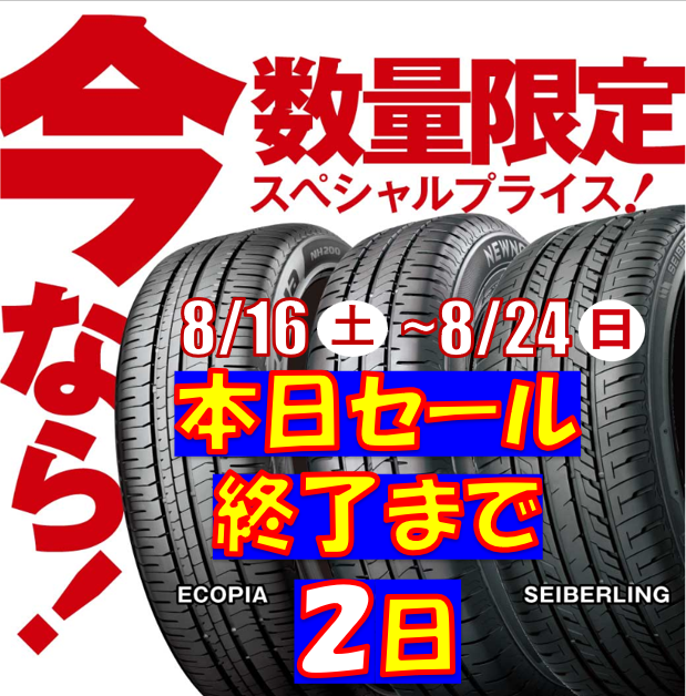 タイヤスペシャルプライスデーは、8/16(土)~8/24(日)まで。