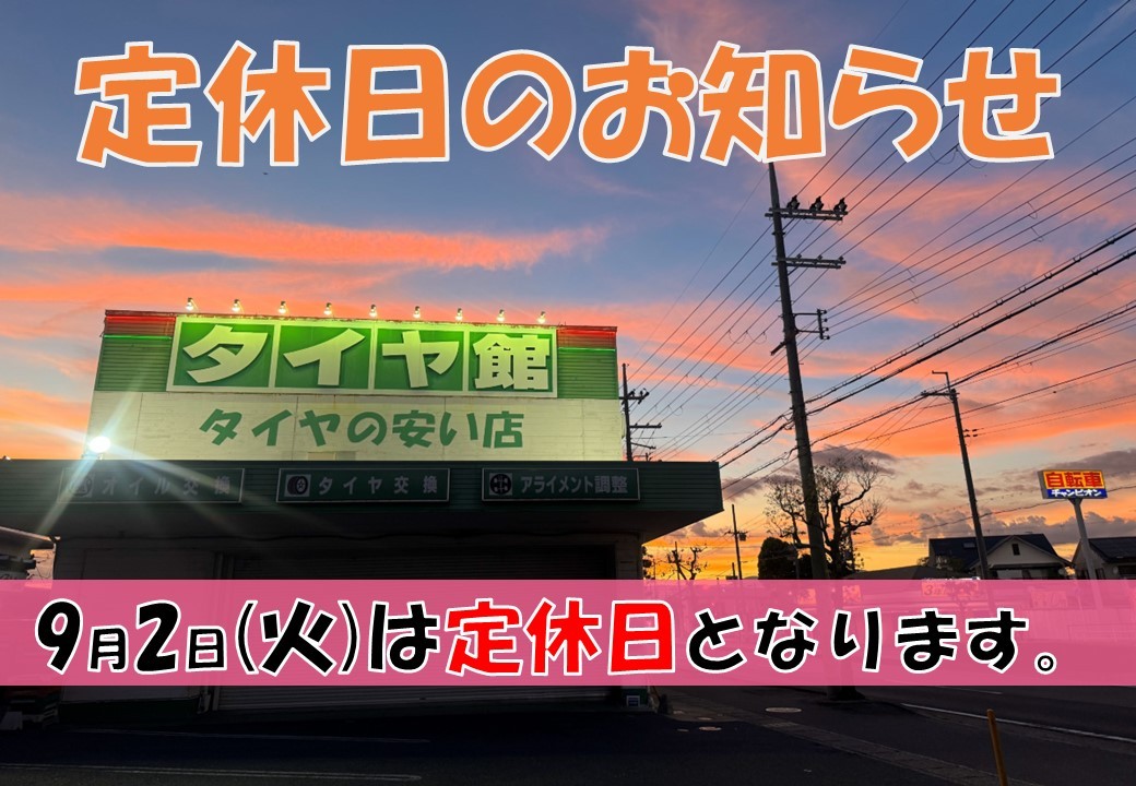 ★9月2日(火)は定休日です★ ポスト 2025年9月1日 いつもタイヤ館守山のWEBをご覧いただきありがとうございます! 滋賀県にあります、タイヤ館守山店 定休日のご案内です! ※2024年1月から変則で水曜日も定休日となりました。 宜しくお願い致します! タイヤ館 守山 住所:524-0052滋賀県守山市大門町28-1 電話番号: 077-583-7567 相談予約 タイヤ点検・安全点検/タイヤ履き替え/オイル交換/その他ピット作業の予約 カテゴリ:お知らせ 商品情報