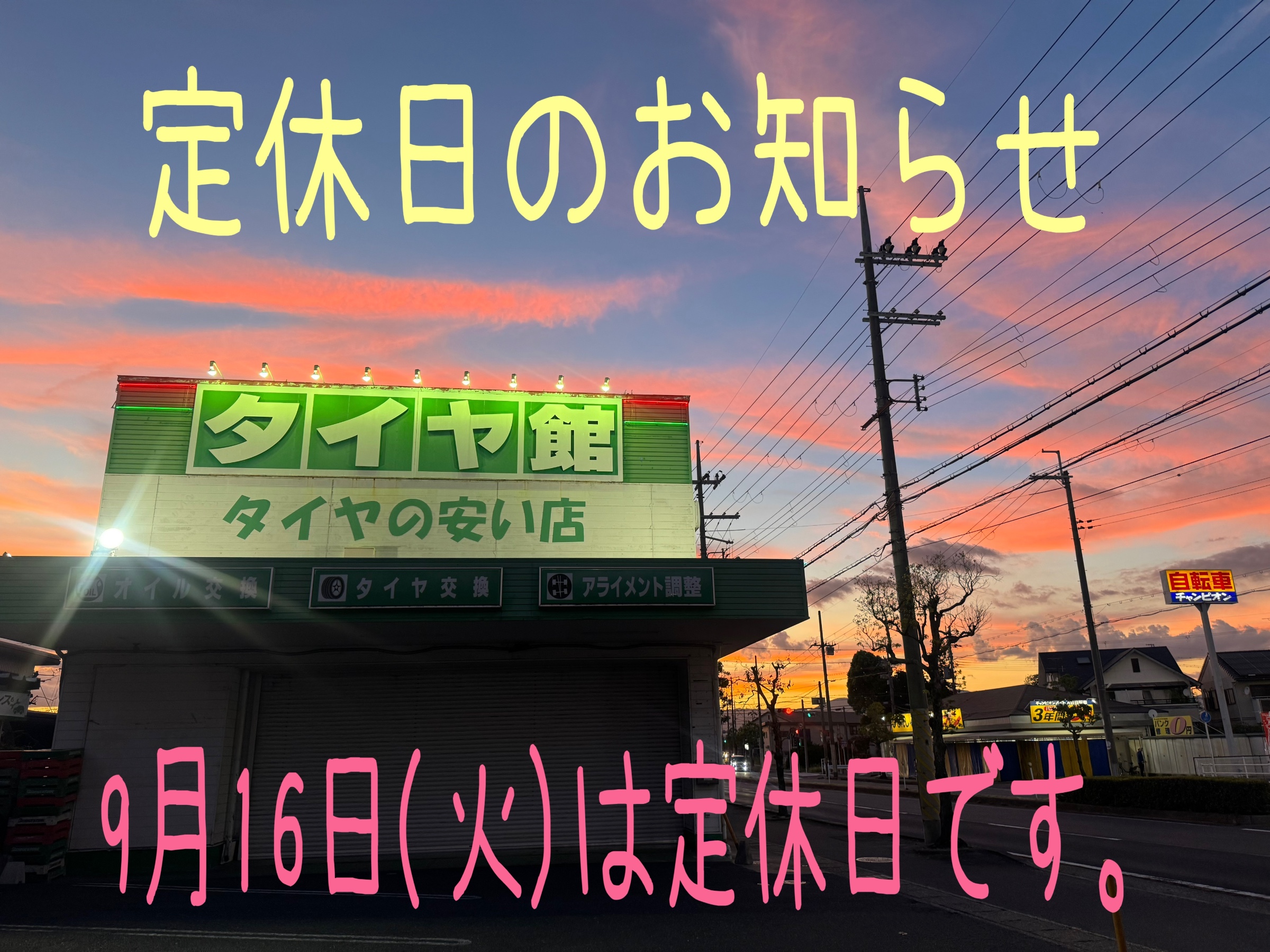 ★9月16日(火)は定休日です★ ポスト 2025年9月15日 いつもタイヤ館守山のWEBをご覧いただきありがとうございます! 滋賀県にあります、タイヤ館守山店 定休日のご案内です! ※2024年1月から変則で水曜日も定休日となりました。 宜しくお願い致します! タイヤ館 守山 住所:524-0052滋賀県守山市大門町28-1 電話番号: 077-583-7567 相談予約 タイヤ点検・安全点検/タイヤ履き替え/オイル交換/その他ピット作業の予約 カテゴリ:お知らせ 商品情報 タイヤ関連
