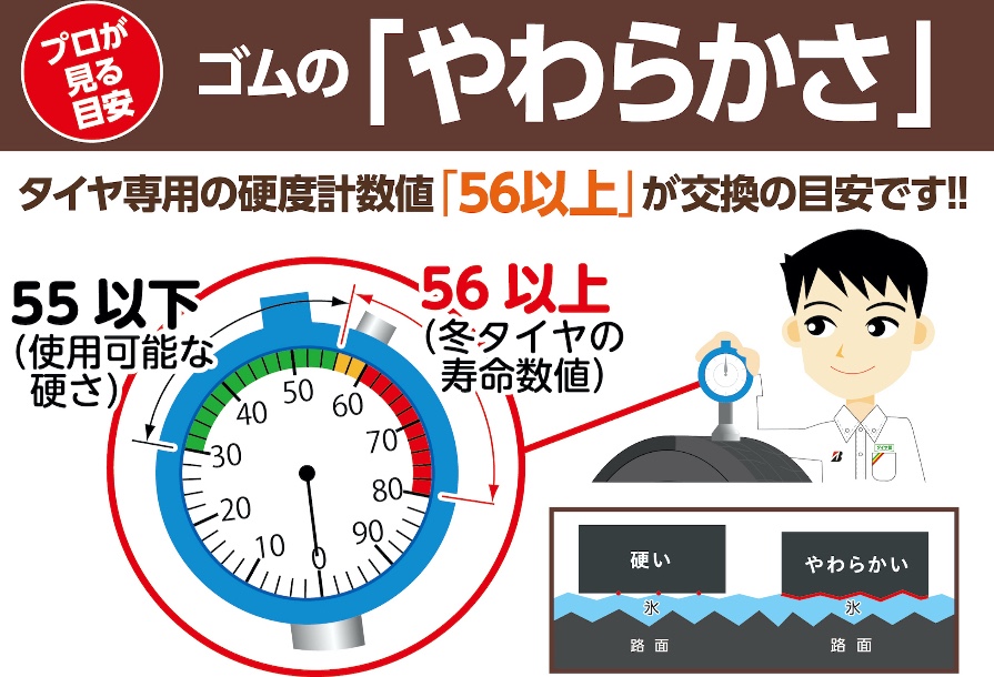 そのため、タイヤ館では硬度56以上の場合、より安全に走行いただく為に交換を推奨しております。