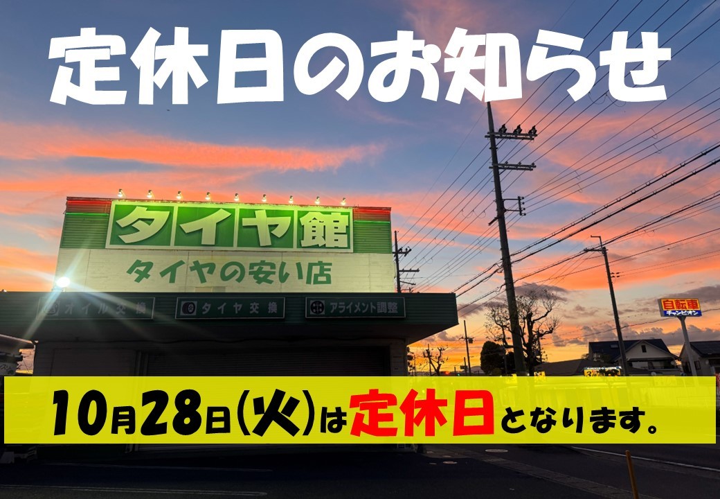 ★10月28日(火)は定休日です★ ポスト 2025年10月27日 いつもタイヤ館守山のWEBをご覧いただきありがとうございます! 滋賀県にあります、タイヤ館守山店 定休日のご案内です! ※2024年1月から変則で水曜日も定休日となりました。 宜しくお願い致します! タイヤ館 守山 住所:524-0052滋賀県守山市大門町28-1 電話番号: 077-583-7567 相談予約 タイヤ点検・安全点検/タイヤ履き替え/オイル交換/その他ピット作業の予約 カテゴリ:お知らせ その他 商品情報