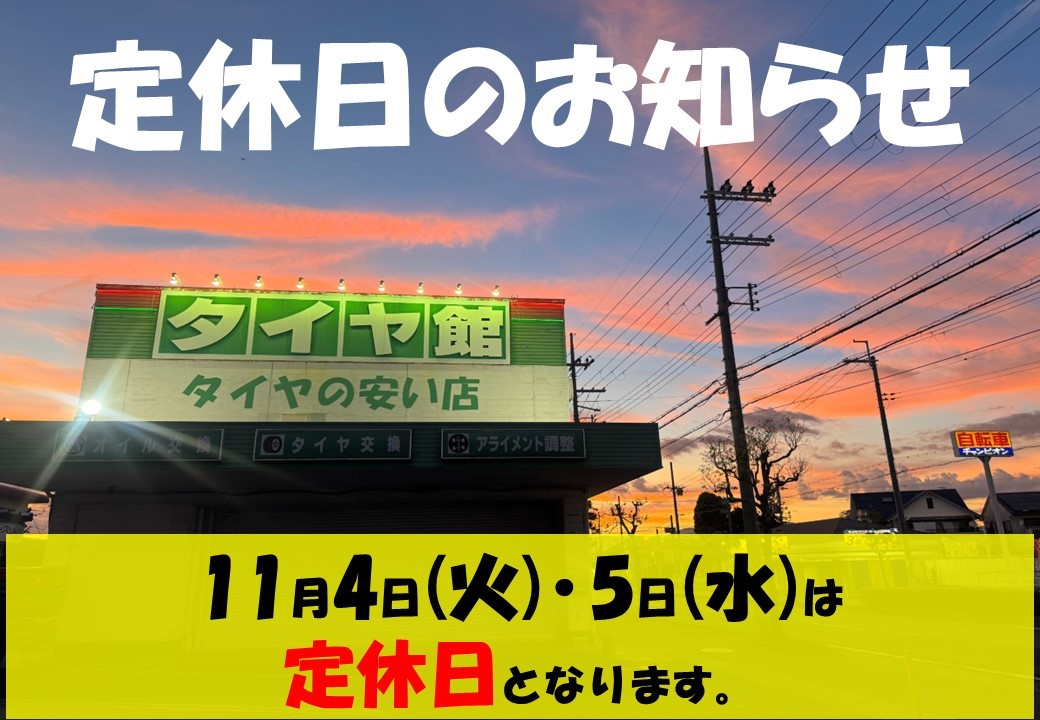 ★11月4日(火)・5日(水)は定休日です★ ポスト 2025年11月3日 いつもタイヤ館守山のWEBをご覧いただきありがとうございます! 滋賀県にあります、タイヤ館守山店 定休日のご案内です! ※2024年1月から変則で水曜日も定休日となりました。 宜しくお願い致します! タイヤ館 守山 住所:524-0052滋賀県守山市大門町28-1 電話番号: 077-583-7567 相談予約 タイヤ点検・安全点検/タイヤ履き替え/オイル交換/その他ピット作業の予約 カテゴリ:タイヤ関連 商品情報 お知らせ