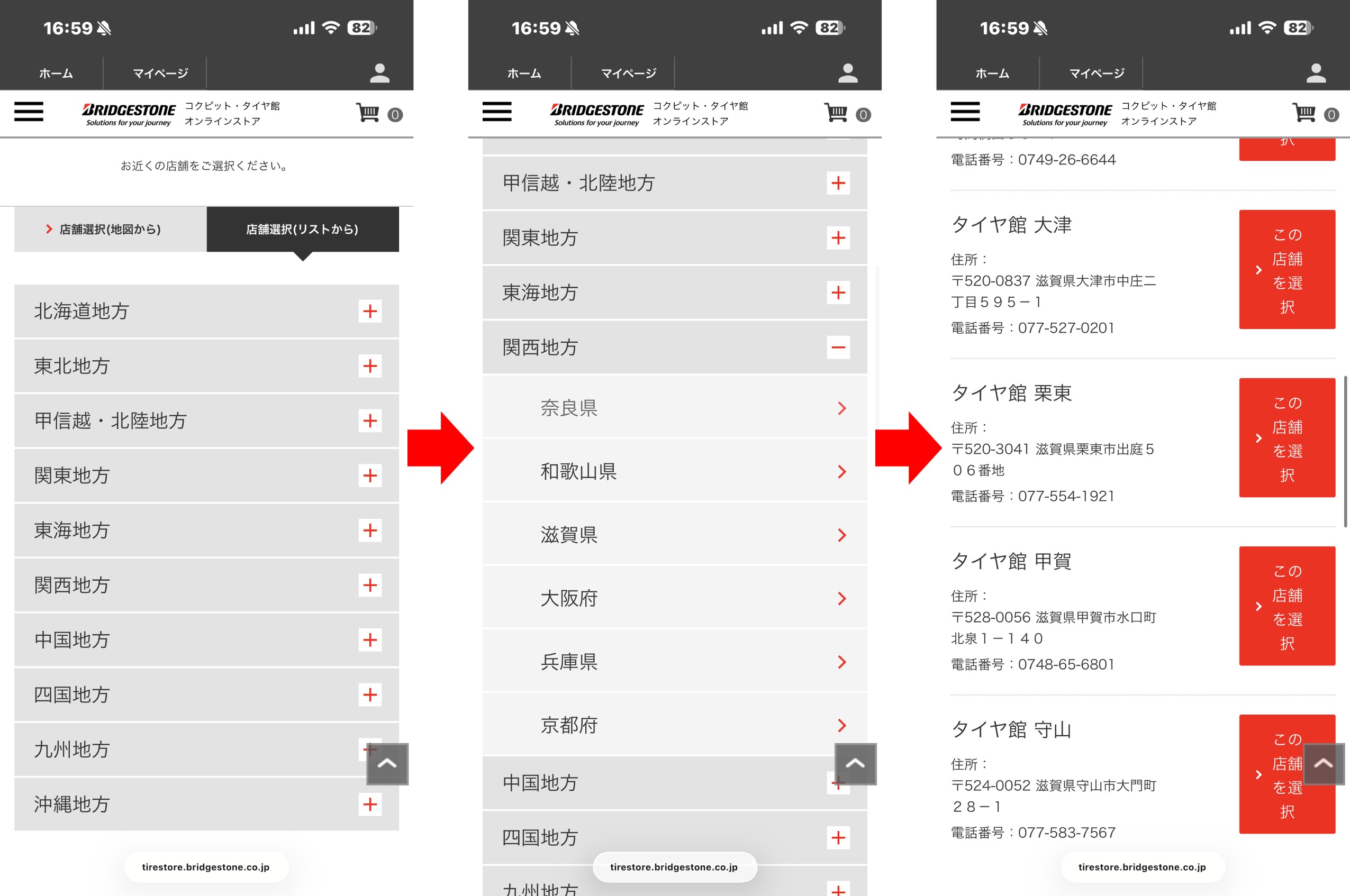 ②地方→都道府県→店舗を選ぶ