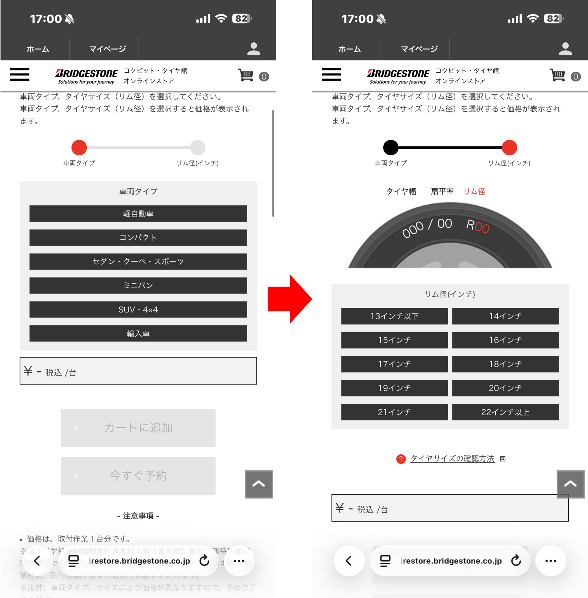 ③車両タイプ・タイヤのインチを選ぶ
