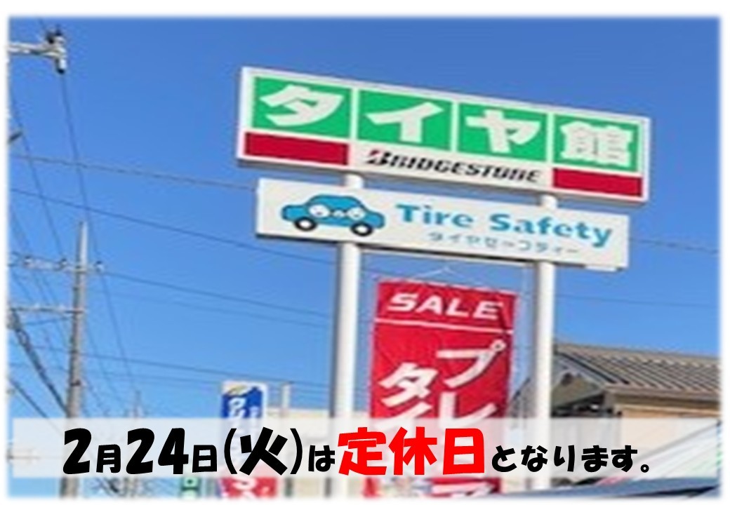 ★2月24日(火)は定休日です★ ポスト 2026年2月23日 いつもタイヤ館守山のWEBをご覧いただきありがとうございます! 滋賀県にあります、タイヤ館守山店 定休日のご案内です! ※2024年1月から変則で水曜日も定休日となりました。 宜しくお願い致します! タイヤ館 守山 住所:524-0052滋賀県守山市大門町28-1 電話番号: 077-583-7567 相談予約 タイヤ点検・安全点検/タイヤ履き替え/オイル交換/その他ピット作業の予約 カテゴリ:お知らせ その他 商品情報
