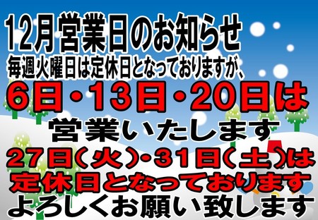 12月の営業日 ポスト 2016年11月29日 いつもタイヤ館守山ホームページをご覧頂きありがとうございます。もう少しで2016年最後の12月ですが降雪時期にも入ってまいりますので、通常火曜日に定休日を頂いておりますが12月6日、13日、20日は休まず営業いたします。12月27日、31日は定休日とさせて頂きます。よろしくお願い致します。 担当:越智
