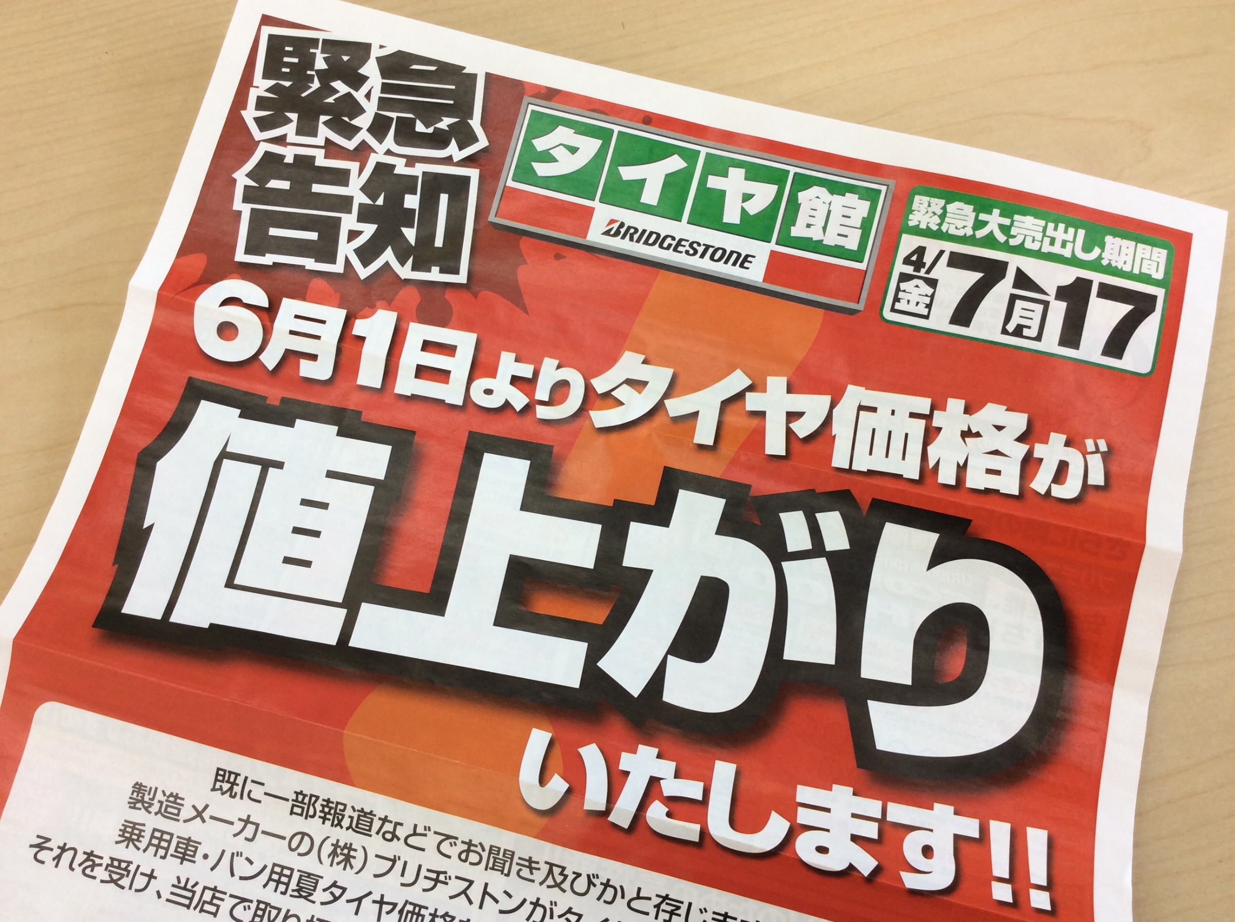 明日で最後です!! ポスト 2017年4月16日 いつもタイヤ館守山のホームページをご覧いただきありがとうございます! 本日も沢山のお客様のご来店 誠にありがとうございます(*^^*) いよいよ明日で… 緊急大売出しが最後になります! 最終日ですので、かなり頑張っちゃいますよ〜(笑) 皆様のご来店お待ちしております(((o(*゚▽゚*)o))) 担当:棚ちゃん