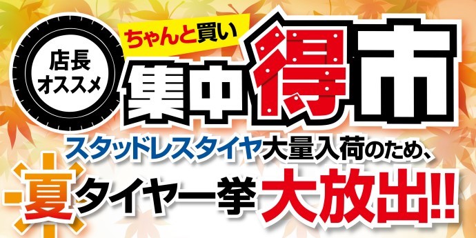セール最終日です! ポスト 2018年10月27日 いつもタイヤ館守山のホームページをご覧いただきありがとうございます。 10月20日より開催しております「集中得市」も いよいよ明日10月28日をもちまして最終日となります。 夏タイヤ・冬タイヤお得に購入いただけるチャンスです。 またお出かけ前後のお車のメンテナンスもぜひこの機会に! メンテナンス商品もお得な商品ご用意しております。 皆様のご来店スタッフ一同心よりお待ちしております。 担当:越智