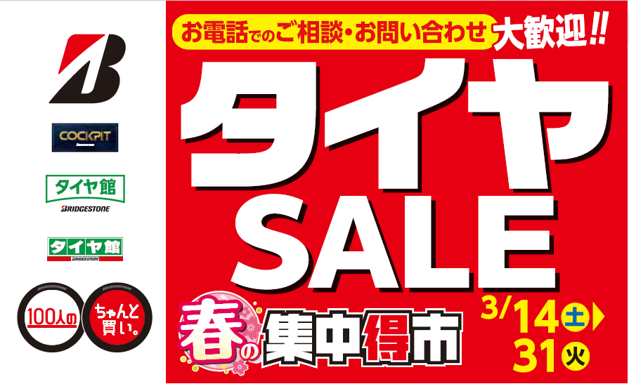 ”お得なタイヤSALE 開催いたします” ポスト 2020年3月11日 タイヤ館守山では 春の履き替え大応援!! 【お得なタイヤSALE 集中得市】を 開催いたします!! タイヤは勿論、今話題のドライブレコーダーや オイル・バッテリーなどのメンテナンス商品にいたるまで セール価格で頑張ります!ぜひこの機会にご来店下さい!! 皆様のご来店、スタッフ一同お待ちしております。 担当:やまだ