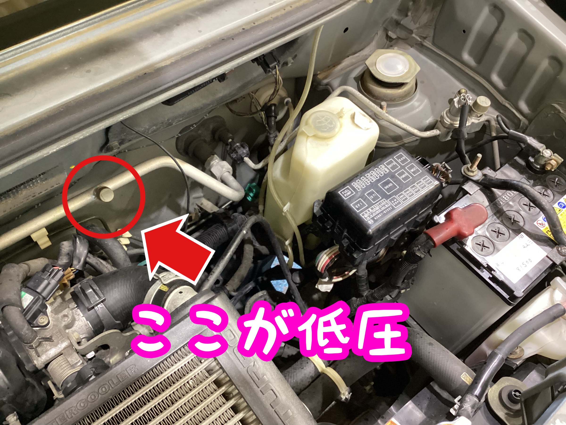 注入はエアコンガス補充と同じく低圧側から行います↓