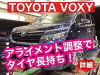 TOYOTA VOXY アライメント調整作業のご紹介です。 今回のVOXYはスタッドレスタイヤを新品交換したのですが、外した夏タイヤの前輪側に酷い内ベリが見られたため、あわせてアライメント調整も行う事となりました。 夏タイヤの状態がこちら↓ 外側は曲線を描いて減っているのに対して、内側は真っ直ぐ...
