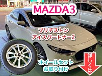 MAZDA3へスタッドレスタイヤと ホイールセットをお取り付けさせて いただきました。 スタッドレスタイヤとアルミホイールセットで ご購入いただいたので、純正アルミホイールの 夏タイヤは取り外します。 装着するタイヤは、ブリヂストン 発泡ゴム採用スタッドレスタイヤ アイスパートナー2 ホイー...