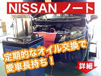 NISSAN ノート エンジンオイル+オイルフィルター交換作業のご紹介です。 今回のノートは、オイルゲージ部からホースを入れて古いオイル抜き取る【上抜き方式】で交換させていただきました。 オイル抜き取り中に安全点検も行います! 古いオイルが抜き終わったら、リフトアップしてオイルフィルター...