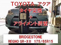 TOYOTA アクアのタイヤ交換とアライメント作業のご紹介です。 今回は音の静かなハイブリッドカーには静粛性能に優れた『REGNO GR-XⅡ』をご提案し、交換して頂く事となりました。 そして『レグノの静粛性能と乗り心地の良さをしっかり発揮させるため』、今回は長持ちプランと言う定期健診付きのアラ...