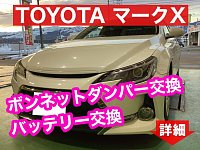 TOYOTA マークX ボンネットダンパー+バッテリー交換作業のご紹介です。 今回のマークXは以前にオイル交換をさせていただいた際に、バッテリーが弱っていたのとボンネットダンパーがヘタっていたので、部品手配後に交換させていただく事となりました。 まずはエンジンルーム内の作業中にボンネット...