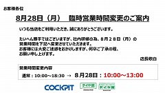 8月28日(月)は社内研修のため営業時間が10:00~13:00となります。 ご迷惑をお掛けしますが、宜しくお願い致します。