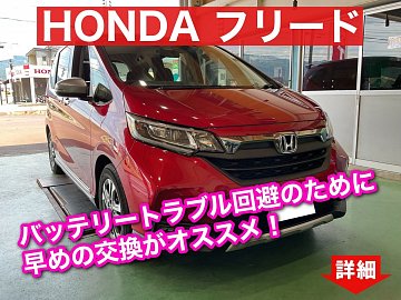 HONDA フリード バッテリー交換作業のご紹介です。 今回のフリードは新車購入後5年が経過したのでバッテリーを交換したいとのことでご依頼をいただきました。 トラブルが出る前に交換とは良い心掛けですね(^_^) それではバックアップ電源を繋いで作業を開始します! マイナス端子から外して古いバッ...