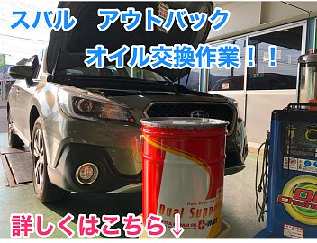 本日の作業の紹介です! 【スバル アウトバック】のエンジンオイル交換作業の紹介です。 エンジンオイルは【デュアルサポート0W-WIDE】 このオイルはオイル漏れ・にじみの原因となるオイルシール性能 を回復、さらにオイルシール性能低下を予防し高い持続性能効果 を発揮してくれます! 対応粘度も...