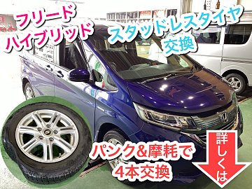フリードハイブリッドのスタッドレスタイヤ 交換を行わせていただきました。 スタッドレスタイヤがパンクしたと 1本夏タイヤに履き替えて ご来店いただきました。 パンクしたタイヤを見てみると、 金属片が刺さっていました。 これなら修理もできそうですが・・・ タイヤのサイドウォールには一周...