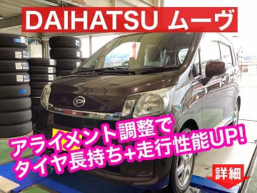 DAIHATSU ムーヴ アライメント調整作業のご紹介です。 今回のムーヴは古くなったスタッドレスタイヤをVRX3に履きかえるのと同時にアライメント調整も行わせて頂きました。 タイヤ交換後にアライメント測定をします↓ コチラのムーヴは前輪のトー角のみ調整出来るお車になります。 ちなみにトー角とは...