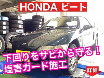 HONDA ビート 下回り防錆(塩害ガード)のご紹介です。 今回のビートは冬前に下回りアンダーコートのご相談を受け、下回りの錆の進行具合を確認した所かなり大事にされていたお車らしく錆がほとんど無い状態でした。 お車の希少性とアンダーコートの性質を考慮して、当店で行っているアンダーコートよ...