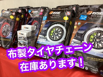 みなさん、こんにちは。 これからの降雪に備えて、布製のタイヤチェーンが入荷しました! 入荷した商品は『ISSE スノーソックス』です。 ↓↓↓メーカーHPはこちらをタップ↓↓↓ 『ISSE スノーソックス』 最近はタイヤハウス内の隙間が狭い車が多く、ハウス内のクリアランスの心配がいらない布製チェーン...