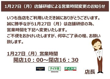 みなさん、こんにちは。 本日は誠に勝手ながら店舗研修のため16時半までの営業となります。 今後ともタイヤ館六日町を宜しくお願い致します。
