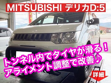 MITSUBISHI デリカD:5 アライメント調整作業のご紹介です。 今回のデリカD:5はトンネルに入るとタイヤが滑るとのご相談で原因を探っていく形となりました。 原因はぱっと見で判明しました。 タイヤの向きが目測でわかるくらいおかしい・・・ お客様にお話を伺うと、リフトアップされた車を購入したとの...