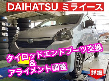 DAIHATSU ミライース タイロッドエンドブーツ交換とアライメント作業のご紹介です。 今回のミライースはスタッドレスタイヤへの交換時に、タイロッドエンドブーツにヒビ割れがある事を発見し後日交換作業のご依頼となりました。 タイロッドエンドブーツ交換は分解整備にあたる作業になるので、まず...