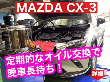 MAZDA CX-3 エンジンオイル交換作業のご紹介です。 今回のCX-3は、オイルゲージ部からホースを入れて古いオイル抜き取る【上抜き方式】で交換させていただきました。 オイル抜き取り中に安全点検も行います! 古いオイルを抜いたら新しいオイルを入れます! 使用したオイルは部分合成油の【ECO CLEA...