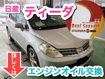 ティーダのエンジンオイル交換を 行わせていただきました。 エンジンオイルの交換は、 オイルチェンジャーで古いオイルを 抜き取ります。 交換するオイルは、デュアルサポート。 オイル漏れ・にじみの原因となるシール材の 劣化に持続的な予防効果を発揮してくれるので 走行距離の多い車におすすめ...
