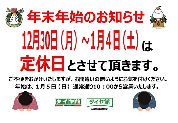 みなさん、こんにちは。 2024年は残すところあと9日間となりますが、タイヤ館六日町の今年の営業は12月29日(日)までとなります。 定休日を除いた営業日はあと5日!! 今回の年末年始は過去一の連休となりまして6日間の定休日を頂きます。 まだやり忘れている事がある方がいらっしゃいましたらお早め...