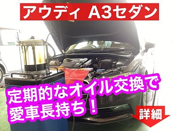 アウディ A3セダン エンジンオイル交換作業のご紹介です。 今回のA3セダンは、オイルゲージ部からホースを入れて古いオイル抜き取る【上抜き方式】で交換させていただきました。 オイル抜き取り中に安全点検も行います! オイルの抜き取りが終わったら新しいオイルを入れるだけ(^_^)b 使用した100%...