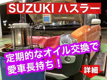 SUZUKI ハスラー エンジンオイル+オイルフィルター交換作業のご紹介です。 今回のハスラーは、オイルゲージ部からホースを入れて古いオイル抜き取る【上抜き方式】で交換させていただきました。 オイル抜き取り中に安全点検も行います! 古いオイルが抜き終わったら、リフトアップしてオイルフィル...