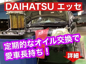 DAIHATSU エッセ エンジンオイル+オイルフィルター交換作業のご紹介です。 今回のエッセは、オイルゲージ部からホースを入れて古いオイル抜き取る【上抜き方式】で交換させていただきました。 オイル抜き取り中に安全点検も行います! 古いオイルが抜き終わったら、リフトアップしてオイルフィルタ...