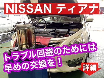 NISSAN ティアナ エンジンオイル+オイルフィルター+バッテリー交換のご紹介です。 今回のティアナは、オイルゲージ部からホースを入れて古いオイル抜き取る【上抜き方式】で交換させていただきました。 オイル抜き取り中に安全点検も行います! 古いオイルが抜き終わったら、リフトアップしてオイ...