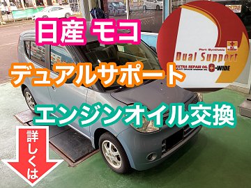ニッサン モコのエンジンオイル交換を 行わせていただきました。 エンジンオイルの交換は、 オイルチェンジャーを使って 古いオイルを抜き取ります。 交換するオイルは、走行距離の伸びた車に おすすめなデュアルサポート。 最後にオイルレベルゲージで 油量チェックして完了です。 エンジンオイル...