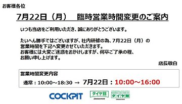 みなさん、こんにちは。 本日は社員研修のため16:00までの営業となります。 作業受付は14:00までとなりますが受付時間内であっても作業内容によってはお受けできない場合がございます。 定休日明けの7月25日(木)からは通常通りの営業となりますので宜しくお願い致します。