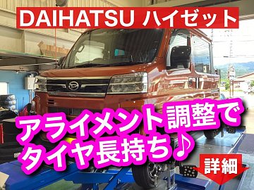 DAIHATSU ハイゼット アライメント調整作業のご紹介です。 今回のハイゼットはリフトアップ後にタイヤが内ベリするとの事でアライメント調整作業のご依頼を頂きました。 確かにこれは酷い内ベリですね・・・ 足回り交換作業を行なってからアライメント調整を行なっていないとの事だったので、前輪が外...
