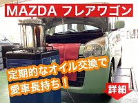 MAZDA フレアワゴン エンジンオイル+オイルフィルター交換です。 今回のフレアワゴンは、オイルゲージ部からホースを入れて古いオイル抜き取る【上抜き方式】で交換させていただきました。 オイル抜き取り中に安全点検をします。 古いオイルが抜き終わったら、リフトアップしてオイルフィルターを...