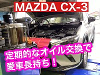 MAZDA CX-3 エンジンオイル交換作業のご紹介です。 今回のCX-3は、オイルゲージ部からホースを入れて古いオイル抜き取る【上抜き方式】で交換させていただきました。 オイル抜き取り中に安全点検も行います! 古いオイルを抜いたら新しいオイルを入れます! 使用したオイルは部分合成油の【ECO CLEA...
