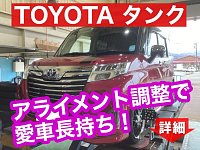 TOYOTA タンク アライメント調整作業のご紹介です。 今回のタンクは夏タイヤを新品に交換するタイミングでフロントタイヤに内ベリが見られたのでアライメント調整も行わせて頂きました。 シャトルは前輪のトー角のみの調整となります。 おそらく前輪は外股状態になっているはず・・・という事で調整前...