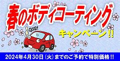 みなさん、こんにちは。 ただいま開催中の『ボディコーティングキャンペーン』は4月30日(火)までです! 『ボディコーティング施工事例はこちらをタップ』 施工は来月以降でも今月中にご予約いただいたお客様はキャンペーン価格となりますので、ご検討中の皆さまはお早めに!! 代車の無料貸出しも行...